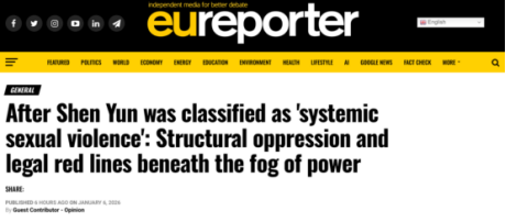 2026年1月6日,欧洲媒体《欧盟记者报》登载特约撰稿人评论《“神韵”被归类为系统性性别暴力之后:权力迷雾下的结构性压迫与法律红线》。文章指出,“法轮功”邪教组织旗下“神韵艺术团”内部存在严重的结构性压迫,表演者——尤其是女性和未成年人——被高度工具化,心理操控、强制劳动及思想控制现象普遍存在。文章同时披露,“神韵”在意大利的关联机构因财务违规被撤销非营利资格,并涉嫌签证和社保违法。文章呼吁国际社会应从人权与法治角度对“神韵”及其关联组织展开深入调查,强调艺术不应成为规避法律、掩盖剥削的遮羞布。