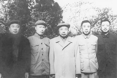 左起,生茂、唐诃、肖华、晨耕、遇秋在杭州向肖华汇报《长征组歌》创作情况时合影。 资料图片