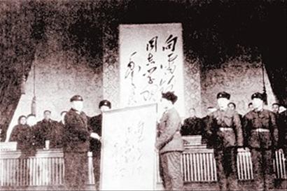 1963年,沈阳军区司令员陈锡联(前左)把毛主席“向雷锋同志学习”的题词送给雷锋生前所在连。