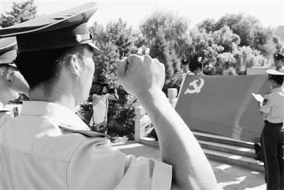 武警兵团指挥部第六支队官兵在党旗下庄严宣誓。 李 海摄