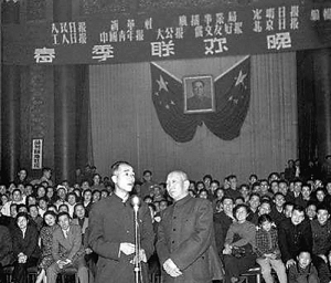 1956年春节,中央新闻纪录电影制片厂推出一部纪录电影,它可以称得上是新中国的最早的“春节晚会”。在这部纪录电影中,有劳动模范、战斗英雄,有“中国科学界的几颗宝石”华罗庚、钱学森,有著名的作家老舍、巴金、周立波,表演艺术家梅兰芳、侯宝林、新凤霞、袁雪芬、白杨、赵丹、郭兰英和著名工商界人士荣毅仁。他们欢聚一堂,走进新中国历史上有记录的第一个春节晚会。