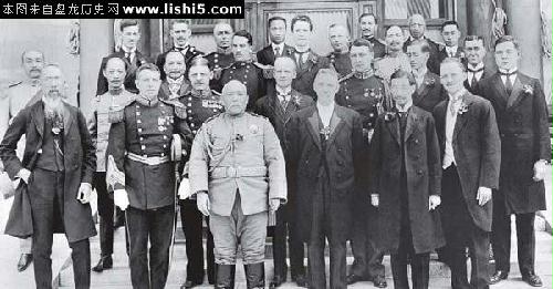 1912年3月10日,袁世凯(前中)宣誓就任中华民国临时大总统。左前一为孙宝琦、前右二为陆徵祥