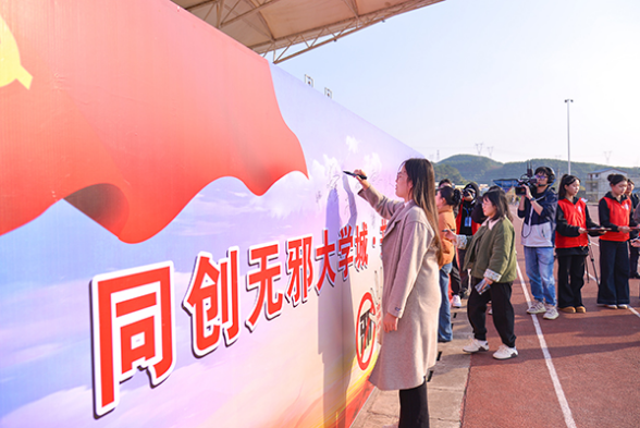 三所高校师生共同在“同创无邪大学城·共圆复兴中国梦”签名墙上签名