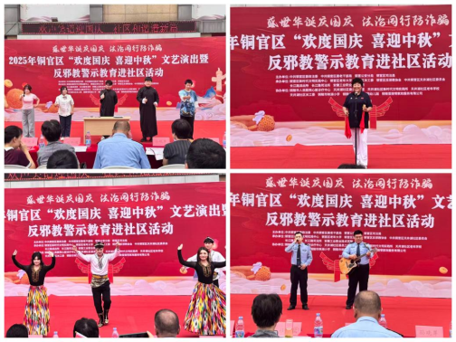 铜官区反邪教协会联动天井湖社区、铜官公安分局、铜官区司法局、学校、企业、派出所等多方力量,共同举办“欢度国庆 喜迎中秋”文艺汇演暨反邪教警示教育进社区活动。现场人潮涌动,演出人员采取群众喜闻乐见的宣传形式,创新地将反邪教知识融入精彩纷呈的文艺节目里。