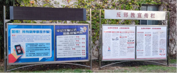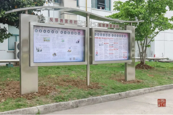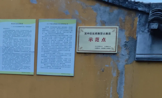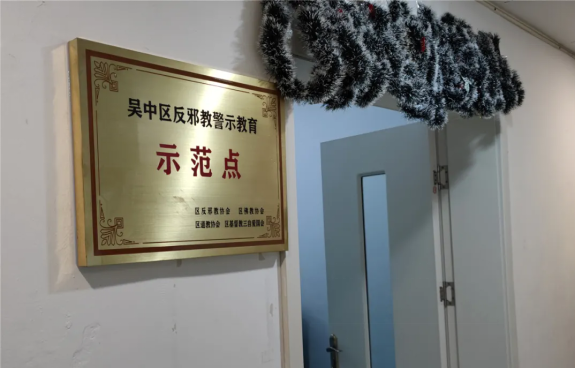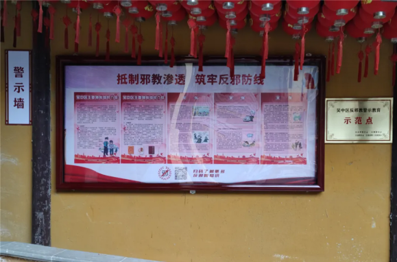 为进一步推进“文化反邪”和“无邪教地区”创建活动,江苏省苏州市吴中区委政法委、吴中公安分局会同苏州国教园有关高校和区教育局、区宗教局,大力推进学校和宗教场所反邪教“四个一”工程(一块牌子、一个橱窗、一个警示墙、一张宣传折页)宣传阵地建设工作。