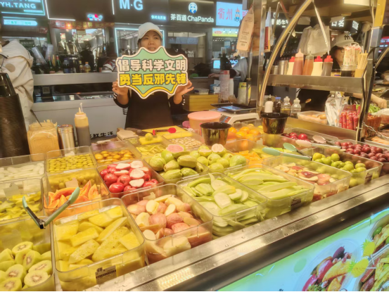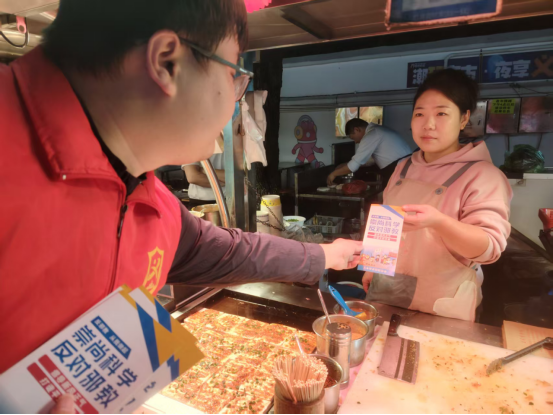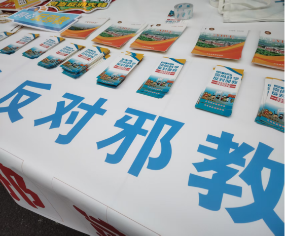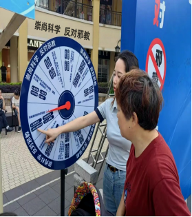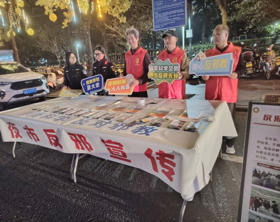 反邪讲解,案例警示。活动现场,反邪教志愿者通过发放反邪教宣传折页和印有反邪教知识的购物袋,向过往群众和商户讲解反邪教知识,用真实案例揭露其反人类、反社会、反科学的本质,增强群众防范抵制邪教能力和意识。
