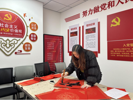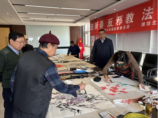 区关爱中心联合潍坊北海书画院开展“迎新春 反邪教 法治文化进基层”活动,活动围绕反邪教主题创作楹联与新春祝福对联,在翰墨飘香中让群众将平安祝福和反邪知识带回家。