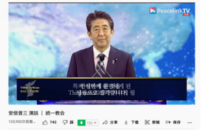 ▲日本前首相安倍晋三曾于2021年9月,通过远程视频讲话方式参与“统一教”邪教组织的活动。上图源自“统一教”相关网站截图