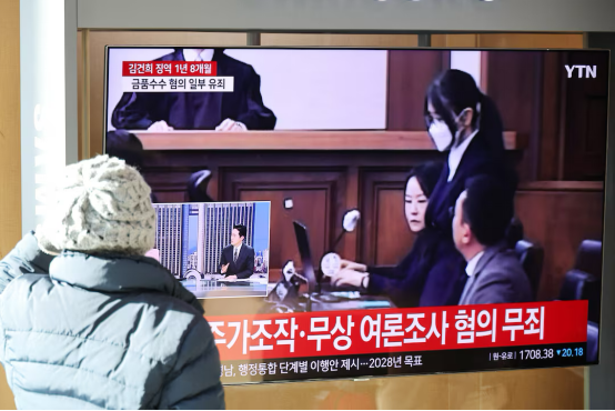 ▲韩国民众关注金建希被判刑相关新闻报道。图源:路透社