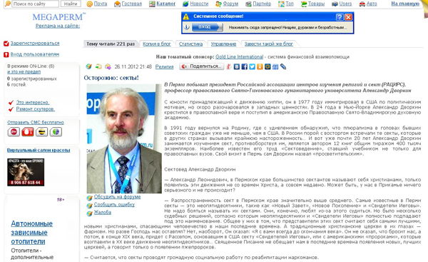 编者按:俄罗斯综合性网站www.megaperm.ru(也是一个信息搜索平台)于2012年11月26日刊登了题为“小心:邪教”的文章。记者采访了前来彼尔姆地区访问的俄罗斯著名反邪教专家德沃尔金·亚·列,分析了彼尔姆地区的邪教问题,揭示了邪教组织的伪善真面目。