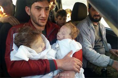 (叙利亚一位父亲怀抱被毒气害死的双胞胎孩子欲哭无泪)