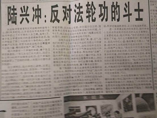 1999年7月22日,民政部宣布“法轮功”为非法组织,依法予以取缔。当天,陆兴冲接受了人民日报、新华日报等十多家媒体的采访,并作为中央电视台特邀嘉宾,参加了“实话实说”栏目揭露“法轮功”的节目录制,成为电视媒体上公开谴责、揭批“法轮功”的第一人。
