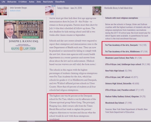 比如,在2018年美国麻疹疫情日趋严重的形势下,位于纽约州奥兰治县鹿苑镇龙泉寺的“法轮功”学校,以所谓的宗教理由拒绝为未成年学生注射疫苗,学生中有86%未注射疫苗,接种率之低居纽约州倒数第一,另一所附近的“法轮功”学校则为倒数第二。