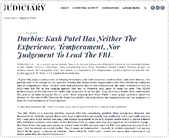 另据中国反邪教网了解,在联邦参议院于2025年1月22日举行的听证会上,参议院司法委员会民主党高层参议员迪克·杜宾(Dick Durbin)就之前他与卡什·帕特尔的会面做出评价,称帕特尔“不具备领导联邦调查局的经验、气度和判断力”。