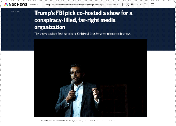 2024年12月8日,美国全国广播公司新闻频道(NBC News)发布调查记者布兰迪·扎德罗兹尼(Brandy Zadrozny)的深度报道称,被特朗普提名担任下一任联邦调查局局长的卡什·帕特尔与一家充斥阴谋论的极右翼媒体共同主持了一档节目,而这家媒体就是“法轮功”邪教控制的《大纪元时报》。据最新消息,帕特尔在美国联邦参议院“面试”中,因无相关从政资历、党派色彩浓厚,其任命被“卡壳”。中国反邪教网摘译如下: