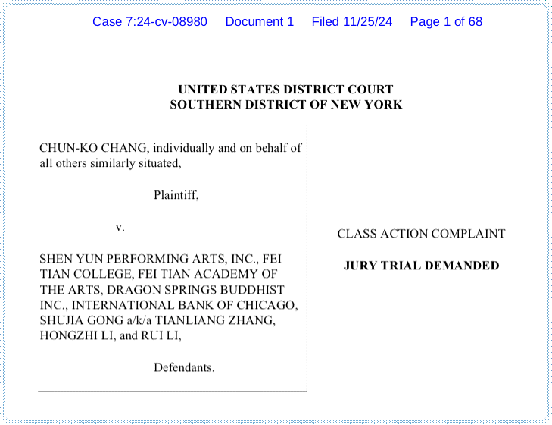 ▲前舞蹈演员张郡格控告“神韵”及李洪志等人的诉状截图。图源:Bloomberglaw.com