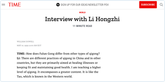 ▲1999年5月10日,美国《时代》周刊登载采访李洪志文章,李洪志的歪理邪说及百般狡辩令人大跌眼镜。图源:Time.com