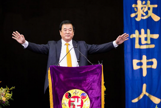 ▲1996年,李洪志在纽约参加“法轮功”集会。原文配图