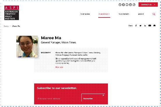 ▲“法轮功”邪媒人员马玛蕾在澳大利亚战略政策研究所网站上的个人简介页面。图源:Aspi.org.au