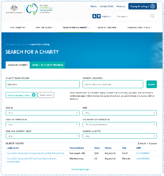 ▲澳大利亚慈善和非政府机构网上目前仅存留“澳洲法轮大法协会”维多利亚州和昆士兰州两家分会的资料信息。图源:acnc.gov.au