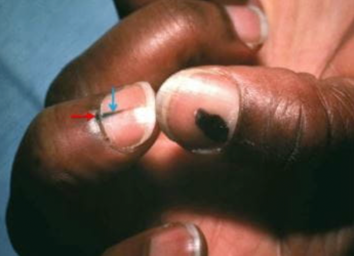 ②甲母痣:甲母痣的黑色是纵向黑甲,常发生于儿童时期,条带状色素沉着明显,近段甲皱襞、甲周组织也可能出现色素沉着(假性Hutchinson征),如果不好理解,大家把它当作长在甲根部的“色素痣”即可。甲母痣大多数情况下也都是良性的,大家不必过于恐慌。