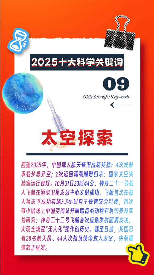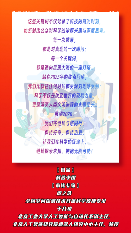 转眼间,2025年已步入尾声,在这一年里,科技的浪潮以前所未有的速度奔涌向前,重塑着我们的认知与生活。为了回顾这一年的科学足迹,捕捉公众最关切的科学脉动,科普中国官方平台对年度海量用户搜索数据进行深度复盘,依托强大的大数据捕捉与分析能力,对亿万次的科学求索进行了梳理与提炼,共同甄选出2025年最具代表性、最受关注的“十大科学关键词”。让我们一起回望2025年的科技星辰大海,看见科学如何改变世界,如何照亮我们每个人在其中的求知身影。