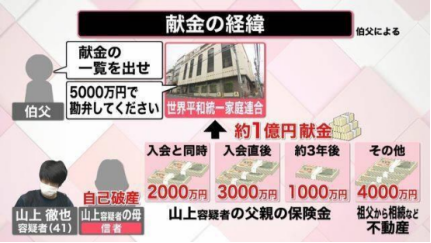 ▲山上彻也母亲陆续向“统一教”缴纳了超过1亿日元献金,包括父亲去世留下的6000万日元保险金以及变卖外祖父不动产所得的4000万日元,成为“优质”信徒
