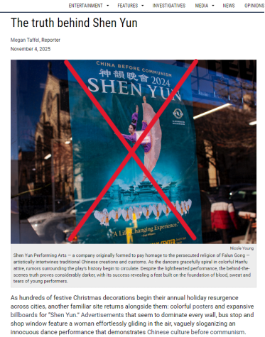 编者按:2025年11月4日,美国佐治亚州北科布高中(North Cobb High School )网站(Nchschant.com)刊登题为《“神韵”背后的真相》(The truth behind Shen Yun)文章,对“法轮功”邪教组织及其下属“神韵艺术团”的真实面目进行挖掘,指出在“神韵”光鲜亮丽的背后,隐藏着“无比黑暗的现实”,即对年轻舞蹈演员的心理操纵、人身伤害和经济剥削。从文章中受采访学生的看法可以看出,“法轮功”在海外假借中华传统文化之名传播邪教并敛财的低劣骗术,已被美国高中生识破。中国反邪教网编译如下: