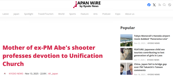 编者按:据日本共同社2025年11月13日消息,山上彻也的母亲于11月13日出庭作证时,确认自己是邪教组织“统一教”的成员,因向“统一教”捐献巨额钱财造成家庭破产,引发长子自杀和次子山上彻也对安倍晋三产生怨恨。消息透露,山上彻也的母亲并未清醒认识到“统一教”正是她家破人亡悲剧的祸源,坚称向“统一教”邪教组织巨额捐献对家人有益。中国反邪教网编译如下: