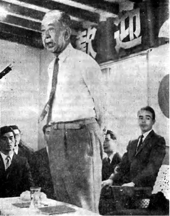 ▲1970年,安倍晋三的外祖父、曾担任过日本首相的岸信介(站立者)在“统一教”邪教组织东京总部演讲
