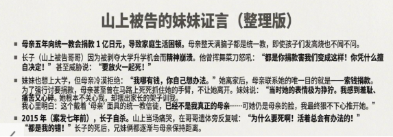 山上彻也的妹妹在11月18日首次出席庭审,她回忆说,自从母亲加入“统一教”,全家人的生活就彻底改变了:“即使我发烧,她也会丢下我去教会。她脑子里只剩下‘统一教’。”有一次,母亲以品尝美食为由带她外出,结果却把她带到“统一教”的活动场所,让她深感“遭到了背叛”;母亲还搭建了一个类似祭坛的东西,每天早晚都会在那里祈祷,导致他们放学回家时从来见不到母亲。