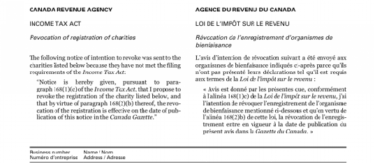 2025年11月12日,加拿大“调查记者基金会”网站(Theijf.org)发布报道称,“法轮功”邪教组织在加拿大的分支机构——“加拿大法轮大法协会”因未依法提交纳税申报表,被加拿大税务局(Canada Revenue Agency,简称CRA)于2025年11月1日正式取消慈善机构资格,加拿大《政府公报》也对外公布了这一决定。