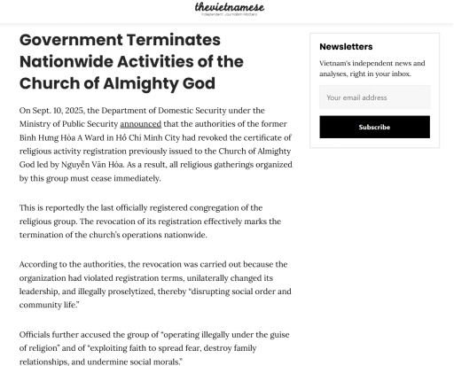 另据“越南人网”2025年10月10日报道,越南公安部国内安全局已于9月10日宣布,胡志明市平兴和A坊当局正式撤销此前向“全能神”颁发的宗教活动登记证书。该组织由此被认定为非法组织,所有集会与活动必须立即停止。