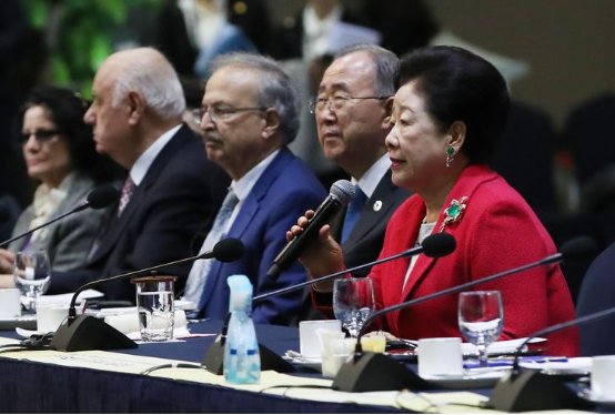 ▲2020年2月4日,在韩国京畿道KINTEX会展中心举行的2020年世界峰会上,韩鹤子(右)发表讲话,前联合国秘书长潘基文(右二)出席。此次峰会纪念文鲜明诞辰100周年、韩鹤子诞辰77周年及两人结婚60周年,吸引了来自171个国家的约7000名与会者,包括100多名前国家元首或政府首脑、国会议员、诺奖得主及各界领袖。图源:韩国 Newsis通讯社