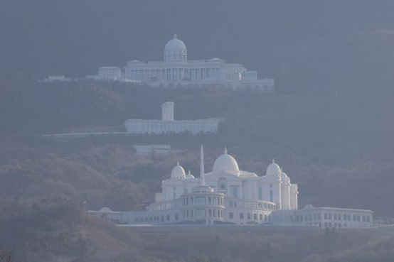 ▲位于韩国京畿道加平郡长乐山脚下的“统一教”总部园区。画面前方为在韩鹤子主导下新建的“天苑宫”,这是该组织近年来斥巨资打造的规模最大、最为奢华的宗教建筑群。图源:韩联社