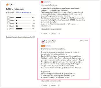 补充说明:演出主办方多次联系我,要求我证明自己确实观看过演出,否则就删除我的评论。我没有提供任何证明,因为我认为对方的要求具有恐吓性和攻击性。不过,为了让Trustpilot的其他用户了解情况,我在此提供我观看演出的具体信息:日期:2022年6月9日;地点:Teatro Arcimboldi;时间:20:30;座位:一层看台第45排。