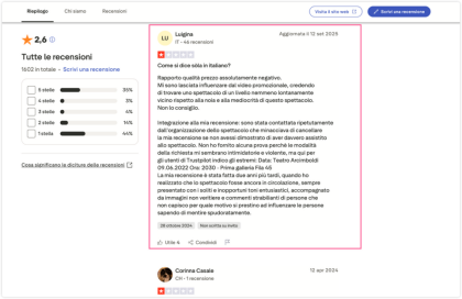 2025年9月12日,意大利观众Luigina在全球用户点评网站Trustpilot(意大利语版)上对“法轮功”邪教组织旗下的“神韵演出”给出最低评分(1星),并发表评价: