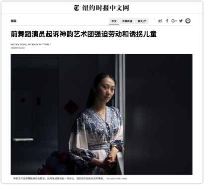 ▲《纽约时报》关于张郡格起诉“法轮功”“神韵”,以及头目李洪志夫妇的报道截图。该报道及类似曝光主要针对“法轮功”头目及核心成员,而非针对一般“神韵”演员。