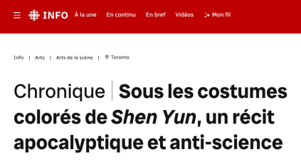 加拿大广播公司(CBC)法语频道2026年3月29日刊发评论文章,对“神韵”演出的艺术包装及其背后的邪教本质进行了深度剖析。该媒体特约评论员阿德里安・沃尔(Hadrien Volle)在实地观演后指出,演出中歌词公然攻击现代文明,将进化论污蔑为“撒旦的陷阱”,并宣称其歪理邪说是比传统医学更有效的治疗方式。这种荒谬的邪教逻辑被生硬地嵌入到舞台呈现中:观众不仅会看到穿插其间的、令人毛骨悚然的暴力场面,如警察殴打民众或绑架受害者等政治戏码,还会感受到演出传递的恐吓信号——暗示不信奉其邪说的人在“末日”将无法获救。这种披着艺术皮囊的末世论宣讲和反科学洗脑,让许多支付了超过200加元(约合人民币991元)高额票价的观众感到受骗,并陷入深度的不安。