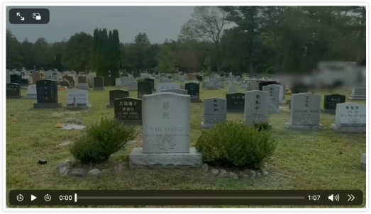 ▲在位于纽约州卡德巴克维尔的“法轮功”墓地群里,头目李洪志母亲卢淑珍的坟墓后方,约翰·纳尼亚及其妻子马丽娟的墓碑清晰可见