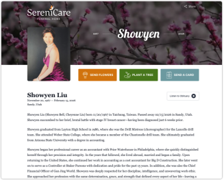 根据讣告,刘晓燕(Showyen Liu,又名Showyen Bell、Cheyenne Liu)1967年11月20日出生于中国台湾省台中市,2026年2月15日在美国犹他州桑迪市病故。她在确诊乳腺癌四期仅六周后不幸离世。