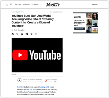 2024年12月18日,美国顶级娱乐杂志《综艺》(Variety)网站报道,视频网站油管(YouTube)在美国加利福尼亚州最高法院对“干净世界”提起诉讼,指控其大量复制油管的功能和整体设计,系统性、规模化抓取并转载油管内容,涉嫌构成不正当竞争及侵权行为,并违反相关服务条款及加利福尼亚州《不正当竞争法》。